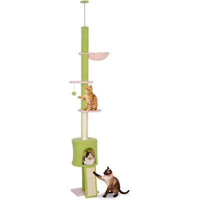 General description For cat owners with limited space, the PawHut floor-to-ceiling cat tree is an ideal solution. Adjustable between 220-240 cm, it creates a stable, vertical playground for 1-2 cats. Cats can jump between platforms, relax in a cozy house, scratch sisal posts, and play with a dangling toy. Covered in plush teddy fabric, it offers a warm, inviting spot for daily comfort and joy. Technical specifications Colour: Green, pink, and cream white Material: Particle board, teddy fleece, and sisal Overall dimensions: 220-240H x 30W x 25D cm Cat box dimensions: 31H x Φ33 cm Door hole dimensions: 22H x 20W cm Jumping platform diameter: Φ30 cm Post diameter: Φ7 cm Ramp dimensions: 39L x 15W cm Base dimensions: 30W x 25D cm Sisal rope diameter: Φ0.3 cm Other information Features a cat house, hammock, and platforms for climbing and relaxing Adjustable height from 220-240 cm fits perfectly in small spaces Floor-to-ceiling tension rod and anti-tip strap for stability Thick 7 cm posts