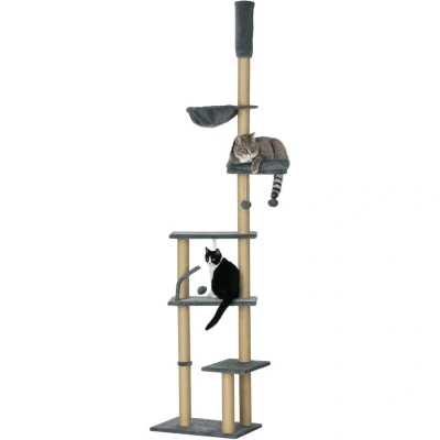 PawHut Floor to Ceiling Cat Tree for Indoor Cats, 6 Tier Play Tower Climbing Activity Center with Scratching Post, Platforms, Bed, Hammock, Adjustable Height 230 250cm, Grey