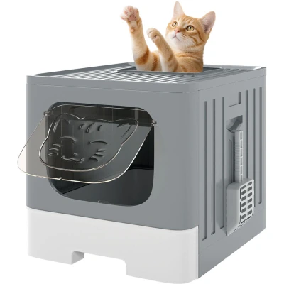 PawHut Foldable Cat Litter Box with Lid, Slide Out Drawer, Grey