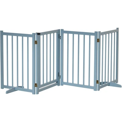 PawHut Freestanding Pet Gate for Small and Medium Dogs, Wooden Foldable Dog Safety Barrier with 4 Panels, 2 Support Feet, 80 cm Tall Doorways, Stairs Blue grey