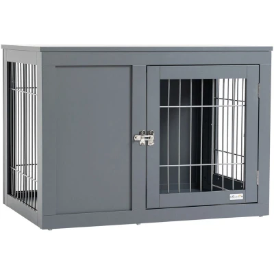 General description Protect your pets with this stylish dog cage from PawHut, which can also be used as a side table, allowing you to display your favorite pieces or store supplies. Made from sturdy MDF and steel, it's strong enough to hold small and medium dogs. Each bar is securely welded to the frame, ensuring the safety of your pets while providing ventilation for their comfort. The crate features two lockable doors for easy access, giving you peace of mind when leaving them alone. Technical specifications Colour: Grey Material: Steel and MDF Dimensions: 59.7H x 83.3L x 55.3W cm Inside cage dimensions: 55H x 78.4L x 50.9W cm Front and side door dimensions: 47.9H x 41.4W cm Bar spacing: 3.7 cm Maximum weight capacity: 15 kg Maximum body length: 65 cm Installation Assembly required Usage Can be used as a dog crate and side table Suitable for small and medium dogs