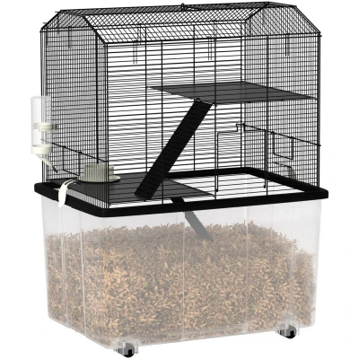 PawHut Hamster Cage, Gerbil Cage 3 Tier with Wheels, Deep Bottom, Ramps, Food Dish, Water Bottle, for Dwarf Hamster, Syrian 58 x 43 74cm Black