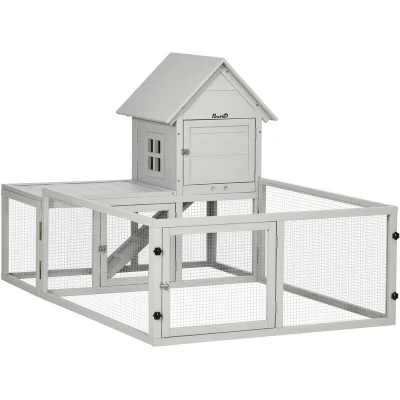General description This spacious PawHut rabbit hutch is designed to provide a safe and comfortable home for small pets such as rabbits and guinea pigs. It features an elevated house for privacy and a large run area surrounded by steel wire for safety, allowing pets to run, hop, and play freely. The hutch includes lockable doors and a slide-out tray for easy cleaning, ensuring a hygienic environment for your pets. Made from sturdy fir wood, this hutch is intended for indoor use, providing a reliable space for your furry friends. Technical specifications Colour: Light Grey Material: Fir wood Overall Dimension: 151.5L x 106W x 97H cm Living House Dimension: 46L x 40W x 56H cm Door Size (Living House): 34L x 27H cm Run Box Dimension: 100L x 46W x 41H cm Door Size (Run Box): 34L x 33H cm Fenced Area Dimension: 100L x 102W x 45H cm Door Size (Fenced Area): 45L x 39H cm Tray Size: 44L x 34W x 4H cm Suitable for: 2-3 rabbits Item Label: D51-358V00LG Other information For indoor use;