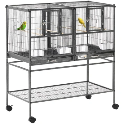General description Keep your pet stimulated, secure, and happy with the PawHut Double Rolling Bird Cage. This indoor parrot cage starter kit features a rolling stand, providing plenty of living space and room for activity. The cage includes 4 wood perches and 4 plastic food containers, ensuring your birds have everything they need to thrive. Technical specifications Color: Black and Gray Material: Metal, Steel, PP, Wood Overall Dimension: 95L x 45.5W x 102H cm Bird Cage Dimension (Single): 47L x 45.5W x 45H cm Front Door: 18W x 23H cm Side Door Size: 13W x 12H cm Metal Tray Size: 45.5L x 43.5W cm Wood Perch Size: Φ1.2 x 47L cm Food Cup Size: 10L x 7.5W x 5H cm Bottom Shelf Size: 95L x 45.5W x 17H cm Item Label: D10-052 Installation Assembly required. Usage Ideal for small-sized birds. 2 large front doors and 2 side doors for easy access to the inside area. 4 sliding feeding doors for convenient access to food and water. Quick cleaning with slide-out metal trays and bottom grate.