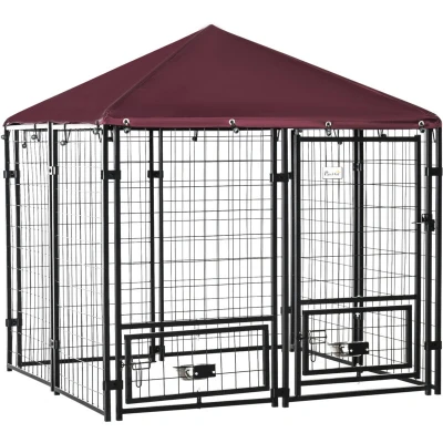 General description Turn your corner into a spacious, cosy PawHut dog kennel for your medium or small pet. Great for indoors and outdoors, it features water-resistant wire and a thick oxford fabric top cover that shields against rain. Your pet will enjoy the space to roam, stretch, and relax, while the lockable gate keeps them safe. The spaced bars allow for ventilation and a view, preventing them from feeling confined. Easy to assemble, you'll have their spot set up in no time, ready for your pet to make it their own! Technical specifications Colour: Black and red Material: Steel and oxford cloth Overall dimensions: With roof: 153H x 141L x 141W cm; Without roof: 112.3H x 141L x 141W cm Single piece dimension: 112.3H x 67W cm Door dimensions: 103H x 56.5W cm Rotating bowl holder on the door: 26H x 49.5W cm Rotating bowl holder beside the door: 26H x 60W cm Bowl dimensions: 6H x Φ18 cm Bowl capacity: 900 ml Wire mesh dimensions: 9.5H x 6W cm Item label: D02-092 Compatibility and