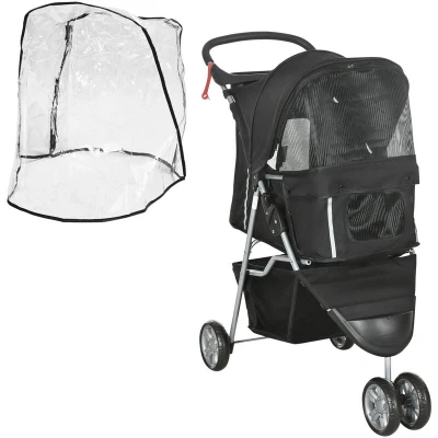 General description This PawHut Pet Travel Stroller is designed for pet owners who need assistance transporting their pets over long distances or for older pets that require extra support. This 3-wheel dog buggy allows your pet to relax comfortably while you push them along. It also features a storage area for food, toys, and other travel supplies, ensuring you have everything you need on the go. The included rain cover keeps your pet warm and dry during travels, providing safety throughout the journey. Technical specifications Colour: Black and Transparent Material: Steel pipe, Oxford cloth, Plastic Overall Dimension: 75L x 45W x 97H cm Folded Dimension: 83L x 45W x 25H cm Internal Dimension: 55L x 35.5W x 52H cm Cover Dimensions: 60L x 34W x 50-68H cm Drink Holder: Φ37 x 12 cm Wheel Diameter: Φ14.5 cm Weight Capacity: 15 kg Item Label: D00-P019 Compatibility and accessories Suitable for small and miniature dogs less than 35 cm in length and less than 10 kg in weight Includes a drink
