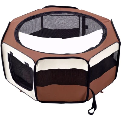 General description This stylish puppy playpen in an octagon shape is a great solution for cats, dogs, and other small animals. It provides a safe environment for pets in countless circumstances, making it perfect for travel. The playpen features 8 panels with breathable mesh that enhances airflow and visibility, ensuring your pets can play and exercise safely and comfortably. Technical specifications Item Name: Pet Playpen Brand Name: PawHut Material Used: 600D Oxford fabric, steel frame Colour: Brown and Cream Product Dimension: Φ90 x 41H cm Folded Size: 41L x 47W x 7H cm Panels size: 37L x 41H cm Compatibility and accessories Ideal for small-sized pets such as dogs, cats, guinea pigs, or other animals Includes 4 ground nails for added stability and safety Attached band for holding a water feeder bottle Side storage pockets for keeping handy items Installation Easy to set up with a strong steel frame Folds completely flat for convenient storage Usage Perfect for indoor and outdoor