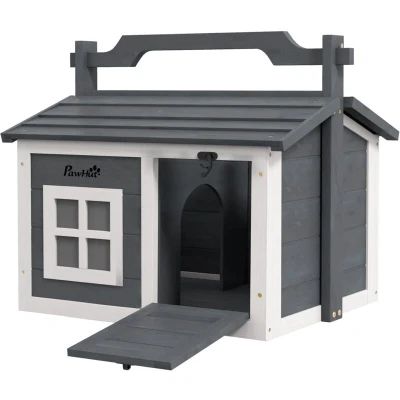 PawHut Rabbit Hutch Cat House Puppy Guinea Pig Small Animal Portable Wooden Indoor Outdoor with 2 Rooms Top Handle, Openable Roof Grey