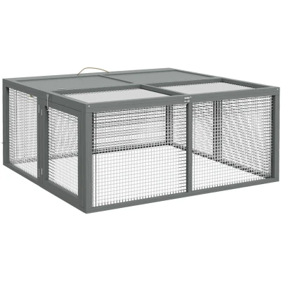 General description Turn any corner into a comfortable and secure haven for small pets with the PawHut Rabbit Hutch. This folding wooden rabbit run is suitable for both indoor and outdoor use, providing a spacious area for your pets to relax and roam freely. Technical specifications Colour: Grey Material: Fir wood and steel wire Overall dimensions: 50H x 110L x 105W cm Folded dimensions: 50H x 110L x 13.5W cm Area: 1.15㎡ Side door dimensions: 42H x 43.5W cm Top door dimensions: 110W x 48D cm Top floor dimensions: 110W x 57D cm Bar spacing: 1.2L x 1.2W cm Item label: D51-430V00GY Usage Accommodates 2-3 small animals such as rabbits or guinea pigs Easy access to pets through multiple doors and an openable top Ideal for providing a secure and spacious environment for pets Other information Foldable design with a handle for easy travel and storage Assembly needed