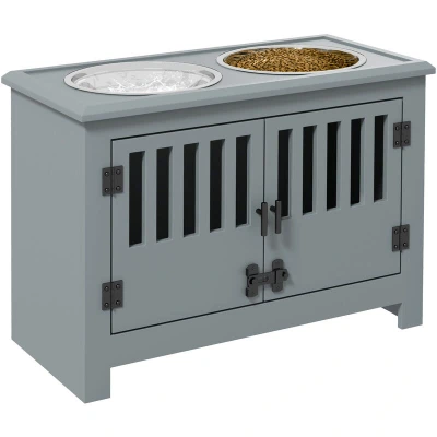 PawHut Raised Dog Bowls for Large Dogs, Pet Feeding Station, Doors with Latch, Storage Cabinet, Two Stainless Steel Grey