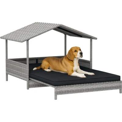 PawHut Rattan Dog House, Extendable Outdoor Wicker Bed w/Water Resistant Roof, Removable Cushion, for Small and Medium Dogs Charcoal Grey