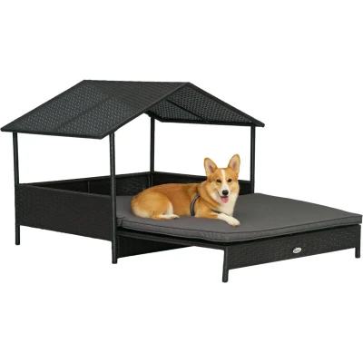PawHut Rattan Dog House, Extendable Outdoor Wicker Bed w/Water Resistant Roof, Removable Cushion, for Small and Medium Dogs Grey