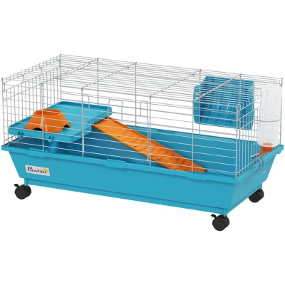 Give your small pet a cozy space with this PawHut cage. The 40×89 cm living area is enclosed with metal wire for safety and airflow. Inside features a small platform with a food bowl, a water bottle, a ramp and a hay feeder, giving them everything they need to stay happy, hydrated and fed. With a large front door and top door for easy access, it's finished with a deep base, which collects dirt and debris, and four wheels to move around easily. Perfect for Rats,Chinchillas and more. Specifications: ● Colour: Blue ● Material: Steel, PP and nylon ● Dimensions: 89L x 44W x 43H cm ● Front door: 25W x 17H cm ● Top door: 54.5L x 25W cm ● Plastic tray: 86L x 42W x 14H cm ● Platform: 45L x 25Wcm ● Ramp: 40L x 13Wcm ● Food dish: 13L x 13W x 4.5H cm ● Water bottle: 26H x Φ6cm ● Item Label: D51-154V00BU Features: ● Suitable for a small rabbit, chinchilla, guinea pig and other similar sized small pets ● 4 universal wheels for easy movement and transportation ● With large front door and top door