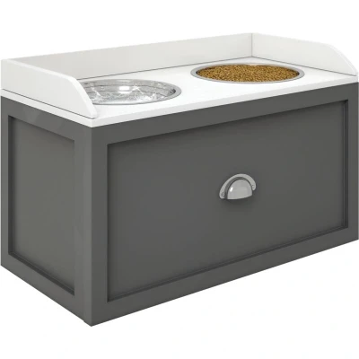 General description With these raised dog food bowls from PawHut, large and older dogs can drink and eat comfortably. Bending down for food causes strain, which can lead to health problems in the future – this won't be an issue with this dog feeding station. It includes two stainless steel bowls for food and water, which are removable for cleaning. There's a hidden cabinet to keep pet supplies, making it quick and easy to refill their bowls. Finished with a sleek design, it will complement your living space perfectly. Technical specifications Colour: Grey and white Material: Stainless steel and MDF Dimensions: 36H x 60L x 30W cm Bowl dimensions: Φ24 x 7 cm Drawer dimensions: 20H x 50W x 21.5D cm Drawer capacity: 21L Bowl capacity: 2L Maximum load: Top and drawer: 15 kg Item label: D08-041V80GY Suitable for large dogs with a shoulder length between 50-60 cm Other information Features a large drawer for pet food and other supplies, keeping everything tidy and organized Includes two