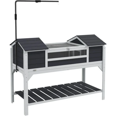 General description Introduce your tortoise to this charming PawHut outdoor tortoise house. This stable wooden structure allows pets to relax in dual hide boxes, while the middle area provides space for them to roam and explore. The clear acrylic window and openable top offer easy access and interaction. Adjust the lamp holder for optimal lighting to maintain the perfect temperature. With a sleek design that fits seamlessly in your home, it serves as a welcoming abode for pets to thrive and prosper. Technical specifications Colour: Grey and white Material: Fir wood, steel, and acrylic Overall dimensions: 93H x 122L x 56.5W cm Inside each main house dimensions: 26L x 46W cm Inside run cage dimensions: 55L x 46W cm Bottom shelf dimensions: 113W x 50D cm Door dimensions: 18H x 17W cm Run top dimensions: 59W x 50D cm Window dimensions: 8H x 59W cm Plastic tray dimensions: 120W x 50D cm Lamp holder dimensions: 80-100H x 36-56W cm Area of main houses: 0.12 m² Area of run cage: 0.25 m²