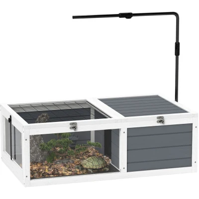 PawHut Tortoise House, Wooden Table, Enclosure with Adjustable Lamp Holder, Openable Lids, Pull Out Trays Grey