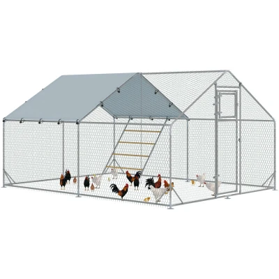 General description House up to 18 chickens with this large chicken run from PawHut. Offering 12m² of space, it provides plenty of room for them to roam. Made with galvanised steel and UV-resistant oxford fabric, it ensures a safe and comfortable shelter. The door features a built-in feeding door for easy access. Inside, you'll find a feeder and perches, so your chickens have everything they need to live comfortably. Technical specifications Colour: Silver tone Material: Galvanised steel pipe, steel mesh, and 420D oxford cloth Overall dimensions: 195H x 300W x 400D cm Top cover: 348L x 200W cm Large door: 160H x 55W cm Feeding door: 42H x 44W cm Mesh grid: 4L x 2.5W cm Perch: 140L x 95W cm Gap: 25 cm Item label: D51-436V01SR Installation Assembly requires two people Estimated assembly time: two hours Usage Suitable for chickens, rabbits, ducks, and geese It is recommended to add a coop for extra warmth and cosiness