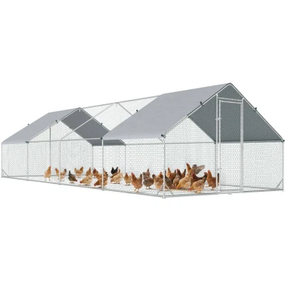 PawHut outdoor chicken cages let your pets enjoy the fresh air, giving them plenty of space to play, relax and explore. Built with stable galvanised steel frames and hexagonal wire mesh, this chicken run is designed to withstand outdoor conditions while keeping your pets secure. The weather-resistant covers add extra protection from sun, rain and wind, so you can relax knowing your furry friends are secure and comfortable no matter the season. Specifications: ● Colour: Silver ● Material: Galvanised steel pipe, plastic-coated steel mesh, PE tarpaulin ● Overall Dimension: 3L x 8W x 2Hm ● Eaves Height: 1.15m ● PE coat: 3.47Lx 2Wm ● Door Dimension: 65W x 165Hcm ● Suitable for 16-24 Chickens ● Item Label: D51-277V03 Just so you know: this item ships and arrives in separate boxes. Delivery times may vary with each box. Box quantity: 2 Features: ● Suitable for chickens, rabbits, ducks and more ● Made with solid galvanised steel for a stable structure ● Steel hexagonal mesh protects your pets
