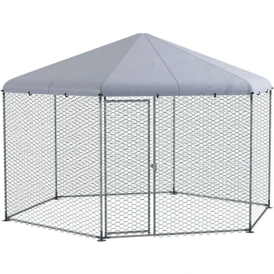 General description Add this spacious PawHut chicken coop to your outdoor space, creating a secure habitat for up to 15 chickens, hens, rabbits, or ducks. It's large enough for you to walk inside, allowing easy maintenance and feeding of your pets. The hexagonal roof provides shelter and shade, ensuring your pets stay cool and dry without water buildup. Crafted with dipped mesh wire and galvanised steel, it offers protection from predators while ensuring optimal airflow, so you can relax knowing your pets are safe and secure. Technical specifications Colour: Silver tone Material: Steel, Oxford fabric, and nylon Overall dimensions: 263H x 400L x 346W cm Door dimensions: 165H x 61W cm Mesh dimensions: 4.5L x 2.5W cm Covered area: 10 m² Item label: D51-399V01SR Features The roof protects from rain and UV rays, keeping the space cool and comfortable Hexagonal canopy prevents rainwater buildup and leaking Tall design allows easy entry and exit Made with solid galvanised steel for a stable