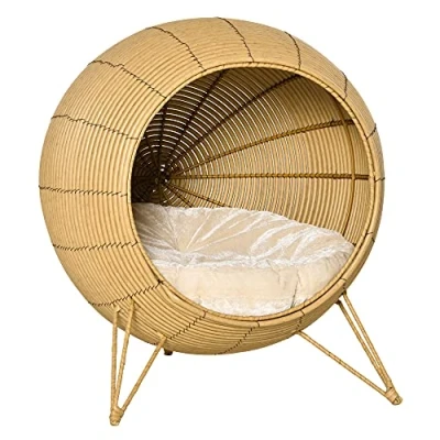 PawHut Wicker Cat Bed Elevated Rattan Kitten Basket Cozy Cave w/ Soft Cushion