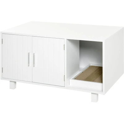 PawHut Wooden Cat Litter Box Enclosure & House with Nightstand/End Table Design, Scratcher, Magnetic Doors, White