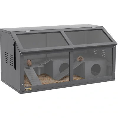 PawHut Wooden Hamster Cage, Small Animal Exercise Play House for Gerbils, Mice w/Suspension Bridge, Ladders, Openable Top, Hut, 85 x 45 44cm Grey