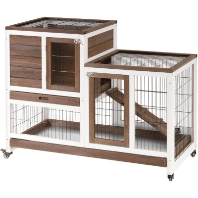 General description This PawHut indoor guinea pig house is suitable for small pets like rabbits and guinea pigs. Crafted from solid fir wood, it features a dual-area design with a cozy house and a spacious lower hutch connected by a large ramp. The structure is finished with water-resistant paint and encased in steel wire for safety. It includes two lockable doors, removable trays for easy cleaning, and four wheels for mobility. Technical specifications Brand: PawHut Colour: Brown and White Material: Fir wood Dimensions: 88H x 110L x 50W cm Top house dimensions: 39.5H x 51L x 46W cm House door dimensions: 22.4L x 34.4W cm House pull-out tray dimensions: 48.5L x 47.5W cm Run door dimensions: 22.4L x 45.5W cm Bottom tray dimensions: 103.5L x 47.5W cm Other information Assembly required Four wheels for easy mobility, with two wheels featuring brakes Raised design keeps animals dry when the ground is wet Non-slip ramp connects the two levels Two-tier design with a top living house and a