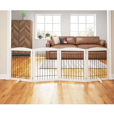 SIMPLE & STURDY: This Convertible Wooden Dog Gate is a Pet Fence, Room Divider, and Pet Pen All In One. Constructed of sturdy wood and strong steel wire . Non-Slip Rubber Feet to protect your floor. FOLDING AND EXPANDABLE DESIGN: This Pet Dog Fence is Free Standing and Can be Folded Out into the Wide Z-Shape Allows You to Use It in Full Hallways, Double Doors, or Standard Doorways, Bedrooms, Staircases or Any Place in Your House. EASY TO SET UP & STORE: The Dog Gate Quickly Unfolds Like an Accordion, Making It Simple to Set Up and Store. NO ASSEMBLE REQUIRED: This Pet Gate Comes Completely Assembled Already. included set of steadying Support feet. EXTRA WIDE AND TALL: OPEN DEMS: UP to 96" Width x0.75" Depth x 31.2" Height; COLLAPSED DEMS: 24" Width x 3" Depth x 31.2" Height; WEIGHT: 31 lbs. FSC-CERTIFIED: Crafted from responsibly sourced FSC-certified wood, the dog gate is durable and stylish—better for your home and the planet.