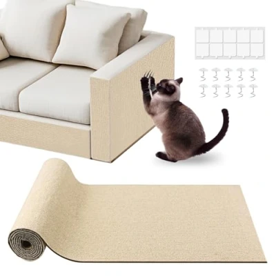 【CUSTOMIZABLE DIY PROTECTION】: Tired of protectors that don't fit? Our scratch mat can be easily cut to any shape with regular scissors. It's perfect for wrapping couch arms, guarding door frames, or even re-covering an old cat tree. You get total protection, exactly where you need it. 【STRONG & VERSATILE ADHESION】: The strong adhesive backing holds tight on almost any surface—wood, glass, tile, you name it. For fabric couches that need a little extra grip, we've included 10 small twist pins. Just a heads-up: it's best not to use the pins on genuine leather to prevent damage. 【A TEXTURE CATS LOVE (AND FURNITURE IS SAFE FROM)】: Made from a durable, carpet-like fiber that's tough enough for the sharpest claws. It gives your cat a super satisfying place to scratch, redirecting them from the furniture you love. Finally, a win-win for both of you. 【EASY, PEEL-AND-STICK INSTALL】: No tools, no fuss. Installation is a breeze: just cut it to size, wipe the surface clean, peel the backing, and press it on firmly. It's simple to get instant protection. 【REMOVES CLEANLY, NO MESS】: Change your mind? No problem. The protector peels right off without leaving behind sticky gunk or damaging your furniture. You get peace of mind knowing your surfaces will stay looking great.