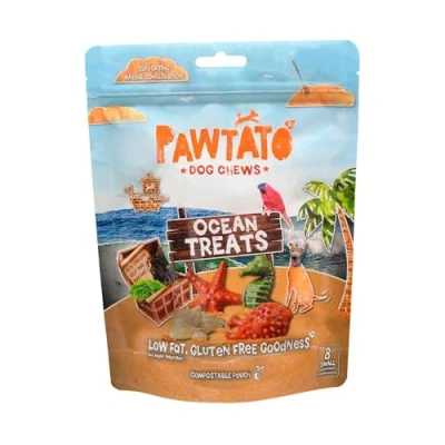 Pawtato vegan dog chews Ocean treats. Natural rawhide alternative Low fat, plant based, hypoallergenic, sweet potato, grain free Small 140g