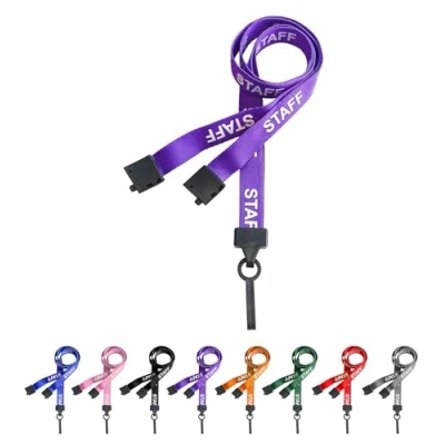 Great Quality Printed Staff Lanyards, Staff is Printed in White Both Sides of the Lanyard so Staff Will always Been Shown. Each Lanyard Comes With a Safety Breakaway Clip. This Stop You From Being Strangled if Caught of Pulled. Great for Identify your staff at work from visitors or non employees Accessories with card holders or pockets from our store 8 Colours To Choose From Black, Blue, Red, Pink, Green, Purple and Grey. We can also do Orange if Needed. You can also search for staff badge holder,staff neck lanyard,staff lanyards with card holders,staff lanyards and badge holders
