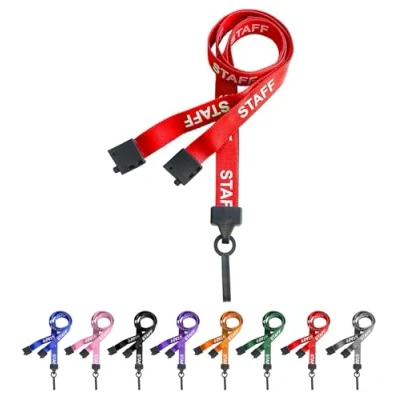 Great Quality Printed Staff Lanyards, Staff is Printed in White Both Sides of the Lanyard so Staff Will always Been Shown. Each staff Lanyard Comes With a Safety Breakaway Clip. This Stop You From Being Strangled if Caught of Pulled. Great for Identify your staff at work from visitors or non employees with these staff lanyards Accessories with card holders or pockets from our store 8 Colours To Choose From Black, Blue, Red, Pink, Green, Purple and Grey. We can also do Orange if Needed. You can also search for staff badge holder,staff neck lanyard,staff lanyards with card holders,staff lanyards and badge holders