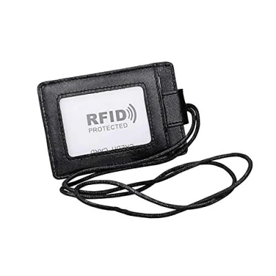 PCL Media ltd RFID Blocking Black Genuine Leather ID Badge Holder Travel Wallet with 1 ID Window and 1 Card Slot and Neck Lanyard Strap (Holds 3 Cards) ID Card Holder with Lanyard
