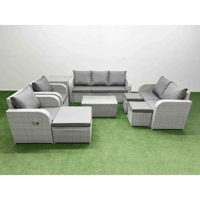General description This deluxe PE rattan sofa set is a great addition to your patio or garden, made of high-quality PE rattan and durable galvanized steel. The set includes adjustable reclining chairs, a love seat, a three-seater sofa, a coffee table, and stools, providing both comfort and style for outdoor lounging. Technical specifications 2 x Reclining chairs: 74W x 69D x 79H cm 1 x Love Sofa: 124W x 67D x 79H cm 1 x 3 Seater Sofa: 177W x 67D x 79H cm 1 x Big footstool: 65L x 65W x 34H cm 2 x Fully Assembled Stools: 40W x 40D x 34H cm 1 x Side table: 65L x 65W x 66H cm 1 x Table: 85L x 50W x 37H cm Sofa Weight Capacity: 250kg Table Weight Capacity: 80kg Color: Light grey rattan with dark grey fabric Installation Items come flat packed and are easy to assemble. The set features sturdy galvanized steel tube metal frames with powder coating to prevent rust. Usage The two armchairs are adjustable, allowing you to change the inclination of the chair back from 90° to 130° for added