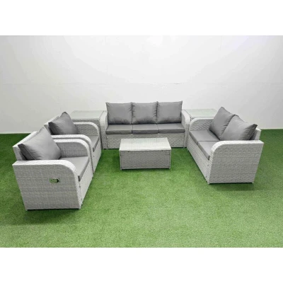 General description This deluxe 7 piece rattan sofa set is a great addition to your patio or garden, made of high-quality PE rattan and durable galvanized steel. The set includes adjustable reclining chairs, a love seat, a three-seater sofa, side tables, and a coffee table, all designed for comfort and style. Technical specifications 2 x Reclining chairs Size: 74W x 69D x 79H cm 1 x Love Sofa Size: 124W x 67D x 79H cm 1 x 3 Seater Sofa Size: 177W x 67D x 79H cm 2 x Side tables Size: 65L x 65W x 66H cm 1 x Coffee Table Size: 85L x 50W x 37H cm Sofa Weight Capacity: 250kg Table Weight Capacity: 80kg Color: Light grey rattan with dark grey fabric Installation Items come flat packed and are easy to assemble. The set features sturdy galvanized steel tube metal frames with powder coating to prevent rust. Usage The armchairs are adjustable, allowing you to change the inclination of the chair back from 90° to 130° for added comfort. The furniture is designed for low maintenance, with