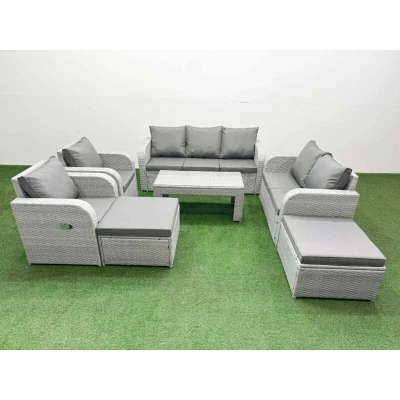 General description This deluxe PE rattan sofa set is an excellent addition to your patio or garden, crafted from high-quality PE rattan and durable galvanized steel. The set includes adjustable reclining chairs and a love seat, providing both comfort and style for outdoor lounging. Technical specifications 2 x Reclining chairs Size: 74W x 69D x 79H cm 1 x Love Sofa Size: 124W x 67D x 79H cm 1 x 3 Seater Sofa Size: 177W x 67D x 79H cm 2 x Big footstool Size: 65L x 65W x 34H cm 1 x Table Size: 105L x 50W x 48H cm Sofa Weight Capacity: 250kg Table Weight Capacity: 80kg Color: Light grey rattan with dark grey fabric Installation Items come flat packed and are easy to assemble. Usage The armchairs are adjustable, allowing you to change the backrest inclination from 90° to 130°. Low maintenance with removable cushion covers. Recommended to keep cushions indoors or use a rain cover when not in use. Other information 5mm thick transparent tempered glass with suckers on the surface to prevent