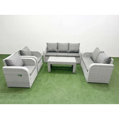 General description This deluxe 5-piece rattan sofa set is an excellent addition to your patio or garden, crafted from high-quality PE rattan and durable galvanized steel. The set includes two adjustable reclining chairs, a love seat, a three-seater sofa, and a rectangular coffee table, all designed for comfort and style. Technical specifications 2 x Reclining chairs Size: 74W x 69D x 79H cm 1 x Love Sofa Size: 124W x 67D x 79H cm 1 x 3 Seater Sofa Size: 177W x 67D x 79H cm 1 x Table Size: 105L x 50W x 48H cm Sofa Weight Capacity: 250kg Table Weight Capacity: 80kg Color: Light grey rattan with dark grey fabric Installation Items come flat packed and are easy to assemble. Includes sturdy galvanized steel tube metal frames with powder coating to prevent rust. Usage Adjustable armchairs allow you to change the backrest inclination from 90° to 130°. Low maintenance with removable cushion covers. Recommended to keep cushions indoors or use a rain cover when not in use. Other information