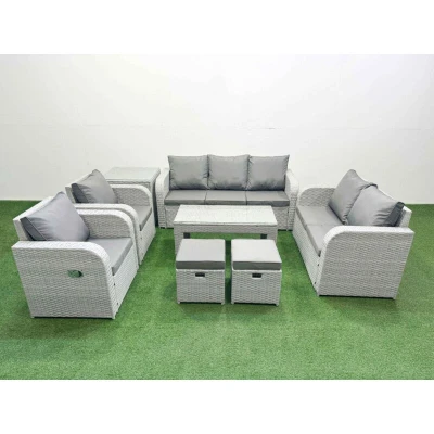 General description This deluxe PE rattan sofa set is an excellent addition to any patio or garden. It is constructed from high-quality PE rattan and durable galvanized steel, ensuring longevity and comfort. The set includes adjustable reclining chairs and a love seat, making it perfect for relaxation and social gatherings. Technical specifications 2 x Reclining chairs: 74W x 69D x 79H cm 1 x Love Sofa: 124W x 67D x 79H cm 1 x 3 Seater Sofa: 177W x 67D x 79H cm 2 x Fully Assembled Stools: 40W x 40D x 34H cm 1 x Side table: 65L x 65W x 66H cm 1 x Coffee Table: 105L x 50W x 48H cm Sofa Weight Capacity: 250kg Table Weight Capacity: 80kg Color: Light grey rattan with dark grey fabric Installation Items come flat packed and are easy to assemble. Sturdy galvanized steel tube metal frames with powder coating to prevent rust. Usage Adjustable armchairs allow for backrest inclination from 90° to 130°. Low maintenance with removable cushion covers. Recommended to keep cushions indoors or use a
