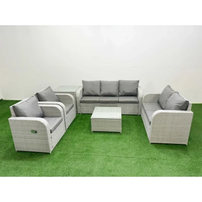 General description This deluxe 6-piece rattan sofa set is a great addition to your patio or garden, made of high-quality PE rattan and durable galvanized steel. The set includes adjustable reclining chairs and a love seat, providing comfort and style for outdoor lounging. Technical specifications 2 x Reclining chairs: 74W x 69D x 79H cm 1 x Love Sofa: 124W x 67D x 79H cm 1 x 3 Seater Sofa: 177W x 67D x 79H cm 1 x Side table: 65L x 65W x 66H cm 1 x Coffee table: 65L x 65W x 34H cm Sofa weight capacity: 250kg Table weight capacity: 80kg Color: Light grey rattan with dark grey fabric Installation Items come flat packed and are easy to assemble. Includes sturdy galvanized steel tube metal frames with powder coating to prevent rust. Usage The armchairs are adjustable, allowing you to change the backrest inclination from 90° to 130°. Low maintenance with removable cushion covers. Recommended to keep cushions indoors or use a rain cover when not in use. Other information 5mm thick