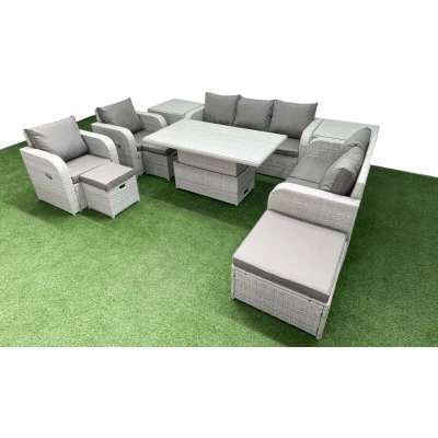 General description This deluxe PE rattan garden furniture set is an excellent addition to your patio or garden. It features high-quality PE rattan and durable galvanized steel, ensuring longevity and comfort. The set includes reclining chairs, a love seat, a three-seater sofa, stools, and side tables, all designed for relaxation and enjoyment. Technical specifications 2 x Reclining chairs Size: 74W x 69D x 79H cm 1 x Love Sofa Size: 124W x 67D x 79H cm 1 x 3 Seater Sofa Size: 177W x 67D x 79H cm 1 x Big footstool Size: 65L x 65W x 34H cm 2 x Fully Assembled Stools Size: 40W x 40D x 34H cm 2 x Side tables Size: 65L x 65W x 66H cm 1 x Lifting Table Size: 140L x 80W x 68/48H cm (height adjustable from 68 cm to 48 cm) Sofa Weight Capacity: 250 kg Table Weight Capacity: 80 kg Color: Light grey rattan with dark grey fabric Installation Items come flat packed and are easy to assemble. Includes sturdy galvanized steel tube metal frames with powder coating to prevent rust. Usage Adjustable