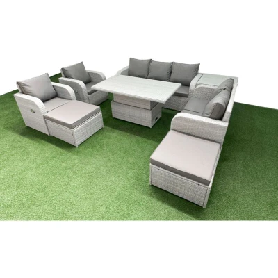 General description This deluxe PE rattan sofa set is a great addition to your patio or garden, made of high-quality PE rattan and durable galvanized steel. The set includes reclining chairs, a love seat, a three-seater sofa, footstools, and a lifting table, providing both comfort and style for outdoor lounging or dining. Technical specifications 2 x Reclining chairs Size: 74W x 69D x 79H cm 1 x Love Sofa Size: 124W x 67D x 79H cm 1 x 3 Seater Sofa Size: 177W x 67D x 79H cm 2 x Big footstool Size: 65L x 65W x 34H cm 1 x Side table Size: 65L x 65W x 66H cm 1 x Lifting Table Size: 140L x 80W x 68/48H cm (height adjustable from 68 cm to 48 cm) Sofa Weight Capacity: 250 kg Table Weight Capacity: 80 kg Color: Light grey rattan with dark grey fabric Installation Items come flat packed and are easy to assemble. Sturdy galvanized steel tube metal frames with powder coating to prevent rust. Usage The 2 armchairs are adjustable, allowing you to change the inclination of the chair back from 90°
