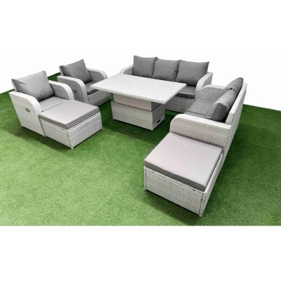 General description This deluxe PE rattan sofa set is a great addition to your patio or garden, made of high-quality PE rattan and durable galvanized steel. The set includes reclining chairs, a love seat, a three-seater sofa, a lifting table, and two big footstools, all designed for comfort and style. Technical specifications 2 x Reclining chairs Size: 74W x 69D x 79H cm 1 x Love Sofa Size: 124W x 67D x 79H cm 1 x 3 Seater Sofa Size: 177W x 67D x 79H cm 2 x Big footstool Size: 65L x 65W x 34H cm 1 x Lifting Table Size: 140L x 80W x 68/48H cm (height adjustable from 68 cm to 48 cm) Sofa Weight Capacity: 250 kg Table Weight Capacity: 80 kg Color: Light grey rattan with dark grey fabric Installation Items come flat packed and are easy to assemble. Sturdy galvanized steel tube metal frames with powder coating to prevent rust. Usage Adjustable armchairs allow you to change the inclination of the chair back from 90° to 130°. Low maintenance with removable cushion covers. Recommended to keep
