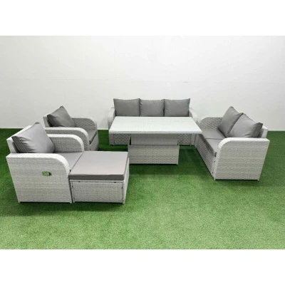 General description This deluxe PE rattan sofa set is a great addition to your patio or garden, made of high-quality PE rattan and durable galvanized steel. The set includes adjustable reclining chairs and a lifting table, providing both comfort and versatility for dining or lounging. Technical specifications 2 x Reclining chairs Size: 74W x 69D x 79H cm 1 x Love Sofa Size: 124W x 67D x 79H cm 1 x 3 Seater Sofa Size: 177W x 67D x 79H cm 1 x Big footstool Size: 65L x 65W x 34H cm 1 x Lifting Table Size: 140L x 80W x 68/48H cm (height adjustable from 68 cm to 48 cm) Sofa Weight Capacity: 250 kg Table Weight Capacity: 80 kg Color: Light grey rattan with dark grey fabric Installation Items come flat packed and are easy to assemble. Sturdy galvanized steel tube metal frames with powder coating to prevent rust. Usage Adjustable reclining chairs with an inclination range from 90° to 130°. Low maintenance with removable cushion covers. Recommended to keep cushions indoors or use a rain cover