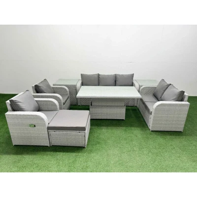 General description This deluxe PE rattan sofa set is an excellent addition to your patio or garden, crafted from high-quality PE rattan and durable galvanized steel. The set includes reclining chairs, a love seat, a three-seater sofa, a big footstool, side tables, and a lifting table, all designed for comfort and style. Technical specifications 2 x Reclining chairs Size: 74W x 69D x 79H cm 1 x Love Sofa Size: 124W x 67D x 79H cm 1 x 3 Seater Sofa Size: 177W x 67D x 79H cm 1 x Big footstool Size: 65L x 65W x 34H cm 2 x Side tables Size: 65L x 65W x 66H cm 1 x Lifting Table Size: 140L x 80W x 68/48H cm (height adjustable from 68 cm to 48 cm) Sofa Weight Capacity: 250 kg Table Weight Capacity: 80 kg Color: Light grey rattan with dark grey fabric Installation Items come flat packed and are easy to assemble. Usage Adjustable reclining chairs with an inclination range from 90° to 130°. Low maintenance with removable cushion covers. Recommended to keep cushions indoors or use a rain cover