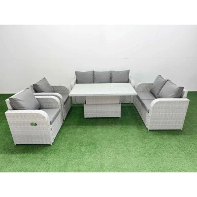 General description This deluxe 5-piece rattan sofa set is a great addition to your patio or garden, made of high-quality PE rattan and durable galvanized steel. The set includes two reclining chairs, a love seat, a three-seater sofa, and a lifting table, all designed for comfort and style. Technical specifications 2 x Reclining chairs Size: 74W x 69D x 79H cm 1 x Love Sofa Size: 124W x 67D x 79H cm 1 x 3 Seater Sofa Size: 177W x 67D x 79H cm 1 x Lifting Table Size: 140L x 80W x 68/48H cm (height adjustable from 68 cm to 48 cm) Sofa Weight Capacity: 250 kg Table Weight Capacity: 80 kg Color: Light grey rattan with dark grey fabric Installation Items come flat packed and are easy to assemble. Sturdy galvanized steel tube metal frames with powder coating to prevent rust. Usage The two armchairs are adjustable, allowing you to change the inclination of the chair back from 90° to 130°. Low maintenance with removable cushion covers. Keep cushions indoors or use a rain cover when not in