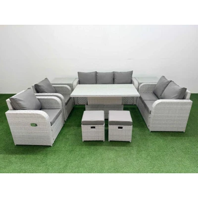 General description This deluxe PE rattan garden furniture set is an excellent addition to any patio or garden. It features high-quality PE rattan and durable galvanized steel, ensuring longevity and comfort. The set includes reclining chairs, a love seat, a dining or coffee table, stools, and side tables, all designed for relaxation and enjoyment. Technical specifications 2 x Reclining chairs: 74W x 69D x 79H cm 1 x Love Sofa: 124W x 67D x 79H cm 1 x 3 Seater Sofa: 177W x 67D x 79H cm 2 x Stools: 40W x 40D x 34H cm 2 x Side tables: 65L x 65W x 66H cm 1 x Lifting Table: 140L x 80W x 68/48H cm (height adjustable from 68 cm to 48 cm) Sofa weight capacity: 250 kg Table weight capacity: 80 kg Color: Light grey rattan with dark grey fabric Installation Items come flat packed and are easy to assemble. Sturdy galvanized steel tube metal frames with powder coating to prevent rust. Usage Adjustable reclining chairs with a back inclination range of 90°-130°. Low maintenance with removable