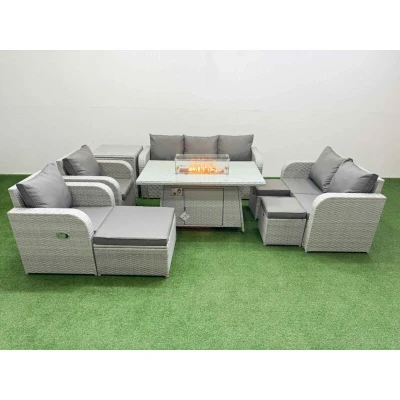 General description This Fimous PE Rattan Garden Furniture Set includes a reclining chair, a double love seat, a 2-seater sofa, a firepit dining table, and three stools, all designed for outdoor comfort and style. The set features light grey rattan with dark grey fabric, providing a modern aesthetic for your garden or patio. Technical specifications 2 x Reclining chairs: 74W x 69D x 79H cm 1 x Love Sofa: 124W x 67D x 79H cm 1 x 3 Seater Sofa: 177W x 67D x 79H cm 1 x Big footstool: 65L x 65W x 34H cm 2 x Fully Assembled Stools: 40W x 40D x 34H cm 1 x Side table: 65L x 65W x 66H cm 1 x Firepit Dining Table: 140L x 80W x 69H cm Sofa Weight Capacity: 250kg Table Weight Capacity: 80kg Material: PE Rattan, Galvanized Steel Tube with Powder Coating Seat Cushion Thickness: 8 cm Glass Thickness: 5 mm Tempered Glass Installation Items come flat packed and are easy to assemble. Usage Adjustable reclining chairs with an inclination range of 90°-130°. For safety, place the gas fire pit on the