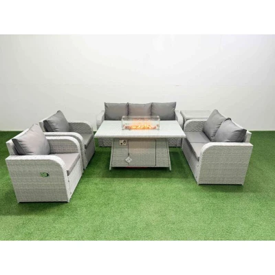 General description This Fimous PE Rattan Garden Furniture Set includes a reclining chair, a double love seat, and a firepit dining table, all designed for outdoor comfort and style. The set features light grey rattan with dark grey fabric, providing a modern aesthetic for your garden or patio. The adjustable armchairs allow you to customize your seating position for maximum relaxation. Technical specifications 2 x Reclining chairs: 74W x 69D x 79H cm 1 x Love Sofa: 124W x 67D x 79H cm 1 x 3 Seater Sofa: 177W x 67D x 79H cm 1 x Side table: 65L x 65W x 66H cm 1 x Firepit Dining Table: 140L x 80W x 69H cm Sofa Weight Capacity: 250 kg Table Weight Capacity: 80 kg Material: PE Rattan, Galvanized Steel Tube with Powder Coating Cushion Thickness: 8 cm Glass Thickness: 5 mm Tempered Glass Installation Items come flat packed and are easy to assemble. Ensure to check the product carefully before signing for delivery. Usage Place the gas fire pit on the glass top of the dining table, not