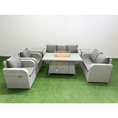 General description This Fimous PE Rattan Garden Furniture Set includes reclining chairs, a love seat, a dining table with a fire pit, and side tables, all designed for comfort and style in your outdoor space. The set features light grey rattan with dark grey fabric, providing a modern look that complements any garden or patio. The adjustable armchairs allow you to customize your seating position for maximum relaxation. Technical specifications Set dimensions: 2 x Reclining chairs: 74W x 69D x 79H cm 1 x Love Sofa: 124W x 67D x 79H cm 1 x 3 Seater Sofa: 177W x 67D x 79H cm 2 x Side tables: 65L x 65W x 66H cm 1 x Firepit Dining Table: 140L x 80W x 69H cm Sofa weight capacity: 250 kg Table weight capacity: 80 kg Material: Light grey PE rattan with dark grey fabric 5mm thick transparent tempered glass on the fire pit table 8 cm thick seat cushion with soft back cushion Installation Items come flat packed and are easy to assemble. Sturdy galvanized steel tube metal frames with powder