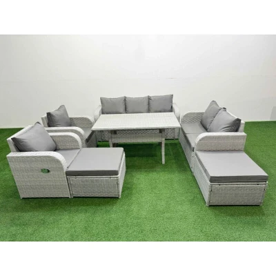 General description This deluxe PE rattan sofa set is a great addition to your patio or garden, made of high-quality PE rattan and durable galvanized steel. The set includes reclining chairs, a love seat, a three-seater sofa, footstools, and a dining table, all designed for comfort and style. Technical specifications 2 x Reclining chairs Size: 74W x 69D x 79H cm 1 x Love Sofa Size: 124W x 67D x 79H cm 1 x 3 Seater Sofa Size: 177W x 67D x 79H cm 2 x Big footstool Size: 65L x 65W x 34H cm 1 x Dining Table Size: 140L x 80W x 68H cm Sofa Weight Capacity: 250kg Table Weight Capacity: 80kg Color: Light grey rattan with dark grey fabric Installation Items come flat packed and are easy to assemble. The set features sturdy galvanized steel tube metal frames with powder coating to prevent rust. Usage The two armchairs are adjustable, allowing you to change the inclination of the chair back from 90° to 130° using a button. The ergonomic high back and reclining design provide extra comfort. The